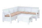 Набор для патио, изготовленный из натурально ротанга, с натуральной отделкой, с деревянным журнальным столиком, а также с подушками на спине.